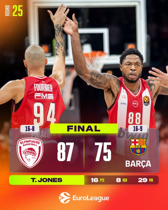 Sin embargo, el equipo local reforzó su defensa y contuvo a los visitantes a solo 11 puntos en el último cuarto para asegurar la victoria gracias a un parcial de 15-2 en los últimos minutos. El Olympiacos mejoró su récord a 16-8 y el Barcelona cayó a 16-9, pero el tiro en suspensión de Jan Vesely sobre la bocina para cerrar el partido dio a los visitantes la ventaja en el tiebreak tras su victoria por 98-85 a principios de diciembre.