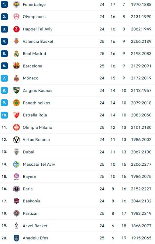 El Bayern ha ganado cinco de sus últimos siete partidos y se acerca lentamente a los playoffs. Isiaha Mike lideró al Bayern con 16 puntos, mientras que Andreas Obst anotó 13, mientras que Vladimir Lucic y Neno Dimitrijevic aportaron 11 cada uno. La derrota dejó al Hapoel con un balance de 16-8, tras dos derrotas consecutivas, y lo dejó en segundo lugar, cediendo el liderato al Fenerbahçe. Vasilije Micic lideró al equipo local con 13 puntos y 5 asistencias.