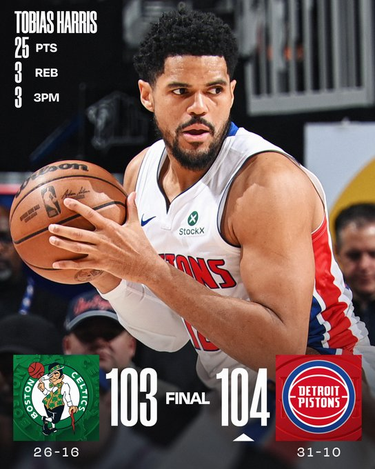 Tobias Harris lideró a Detroit con 25 puntos en un duelo de alto voltaje que se definió en la última bola. Cade Cunningham firmó un doble-doble de 16 puntos y 14 asistencias, mientras que Jalen Duren sumó 18 y 9 rebotes. Jaylen Brown, All-Star starter, anotó 32 para Boston pero falló el tiro ganador sobre la chicharra.