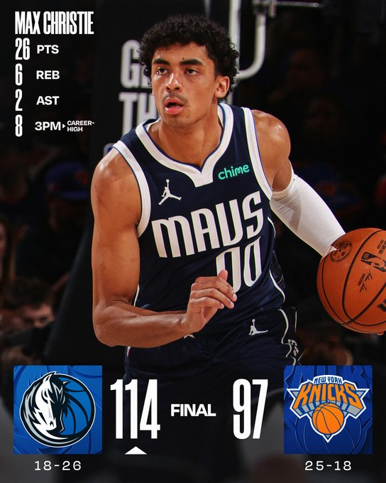 Los Mavericks dominaron en el Madison y superaron con claridad a unos golpeados Knicks por 114-97 con 26 puntos y 8/10 en triples de Max Christie, 18 de Cooper Flagg y 19 de Naji Marshall. Lo mejor de New York fueron los 22 puntos y 18 rebotes de Karl Anthony Towns y los 22 de Jalen Brunson.