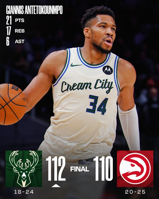 Milwaukee logró un triunfo importante para seguir luchando por 112-110 en su visita a Atlanta. Giannis Antetokounmpo fue líder de un equipo con 6 jugadores en doble dígito, autor de 21 puntos y 17 rebotes, seguido por 19 de Bobby Portis y 18 de AJ Green. Lo mejor de los Hawks pasó por los 32 puntos de Nickeil Alexander-Walker y los 28 más 16 rebotes de Jalen Johnson.
