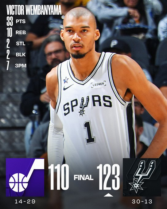 Los Spurs lograron una buena victoria como locales por 123-110 ante el Jazz con un dominante Victor Wembanyama, autor de 33 puntos y 10 rebotes, seguido por 18 y 8 asistencias de Stephon Castle y 15 de Dylan Harper. En Utah lo mejor fueron los 30 puntos de Keyonte George y los 20 más 9 rebotes de Jusuf Nurkic.