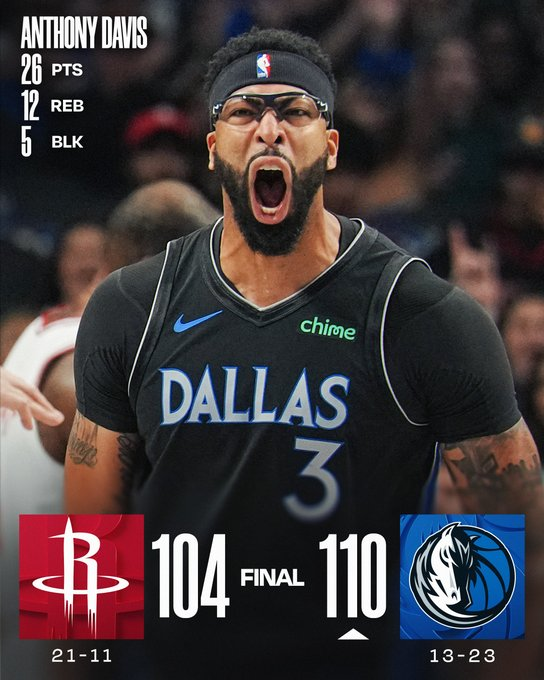 Anthony Davis dominó la pintura con 26 puntos y 12 rebotes y Max Christie sumó 24, con 4 triples clave, para cortar la racha negativa de Dallas. Kevin Durant respondió con 34 puntos para Houston, bien secundado por Amen Thompson (20 y 12 rebotes) y Tari Eason (19 y 10). La lesión temprana de Alperen Sengun condicionó a los Rockets, pese a su ventaja en rebotes ofensivos.
