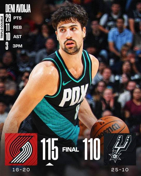 Deni Avdija firmó un triple-doble completo (29 puntos, 11 rebotes y 10 asistencias) y fue el eje de un Portland que lideró casi todo el partido. Donovan Clingan aportó 24 puntos y 12 rebotes, mientras Toumani Camara sumó 20. San Antonio, sin Wembanyama ni Vassell, tuvo 20 de Luke Kornet y 20 más 10 rebotes de Julian Champagnie.