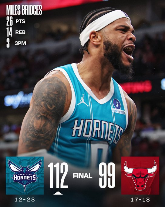 Miles Bridges fue figura con 26 puntos y 14 rebotes, acompañado por 22 de Brandon Miller y 18 de Kon Knueppel en una remontada sólida. Charlotte revirtió el partido con un tercer cuarto dominante (32-17) y cerró con un 10-0 en el último período. Nikola Vucevic sostuvo a Chicago con 28 puntos, 8 asistencias y 7 rebotes.