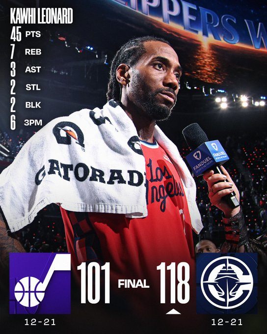 Kawhi Leonard protagonizó una noche memorable con 45 puntos, dominando el último cuarto casi en soledad y extendiendo la racha de los Clippers a seis victorias. James Harden colaboró con 20 puntos, mientras Utah reaccionó desde el banco con 22 de Kyle Anderson y 20 de Brice Sensabaugh. La jerarquía de Leonard terminó inclinando un partido que había cambiado de manos varias veces.