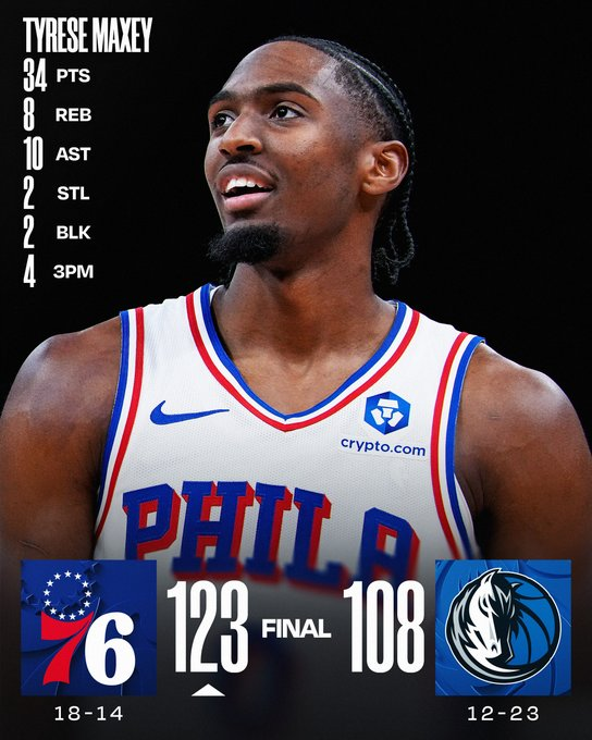 Tyrese Maxey brilló en su ciudad natal con 34 puntos, 10 asistencias y 8 rebotes, liderando una sólida actuación colectiva de Philadelphia. Joel Embiid sumó 22 tantos y el novato VJ Edgecombe hizo 23, manteniendo la eficacia ofensiva de los Sixers. Dallas, con Anthony Davis de regreso (13 puntos, 8 rebotes), volvió a caer y acumuló su cuarta derrota consecutiva.