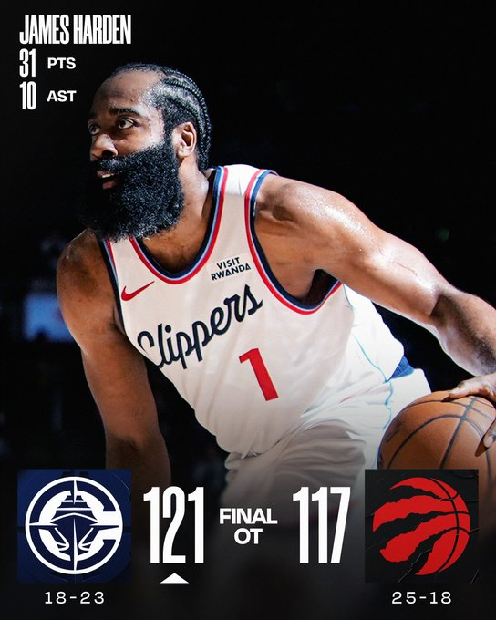 James Harden lideró a los Clippers con 31 puntos y 10 asistencias en una victoria en tiempo suplementario. El escolta forzó el overtime con un gran cierre en el tiempo regular y luego fue clave desde la línea. Scottie Barnes anotó 24 para Toronto.