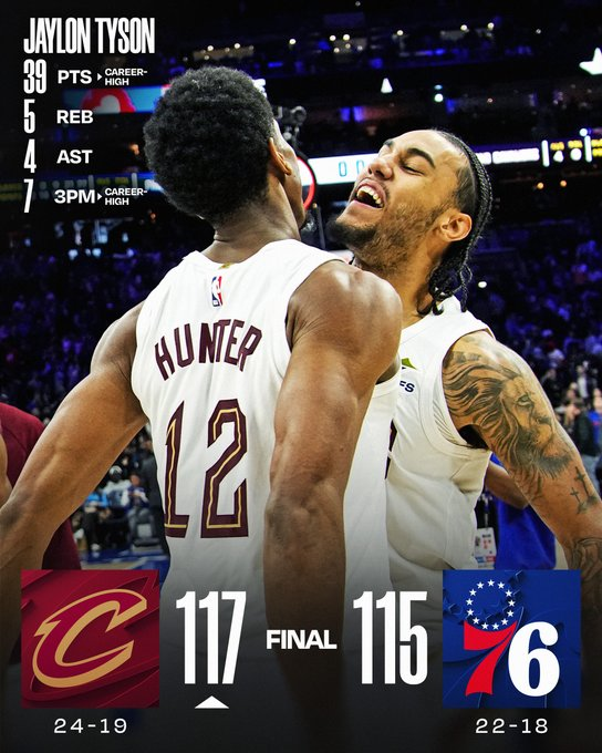 Jaylon Tyson explotó con 39 puntos y Evan Mobley definió el juego con una volcada a segundos del final. Cleveland remontó en el último cuarto pese a jugar sin Darius Garland. Joel Embiid fue el máximo anotador de Philadelphia con 33 puntos.