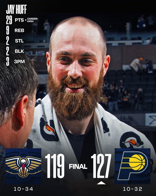 Los Pacers se impusieron en casa con una noche histórica de Jay Huff, autor de 29 puntos y nueve rebotes, su mejor marca en la NBA. Pascal Siakam aportó 27 y el equipo colocó a cinco jugadores en doble dígito. En los Pelicans, Zion Williamson lideró con 27 puntos, pero no alcanzó.