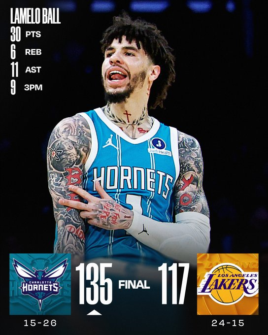 Charlotte sorprendió en Los Ángeles con una actuación estelar de LaMelo Ball, autor de 30 puntos, 9 triples y 11 asistencias, la mayoría en una segunda mitad demoledora. Brandon Miller (26) y Miles Bridges (25) acompañaron el golpe, mientras que Luka Doncic respondió con 39 puntos y seis triples para unos Lakers que volvieron a mostrar fragilidad defensiva.