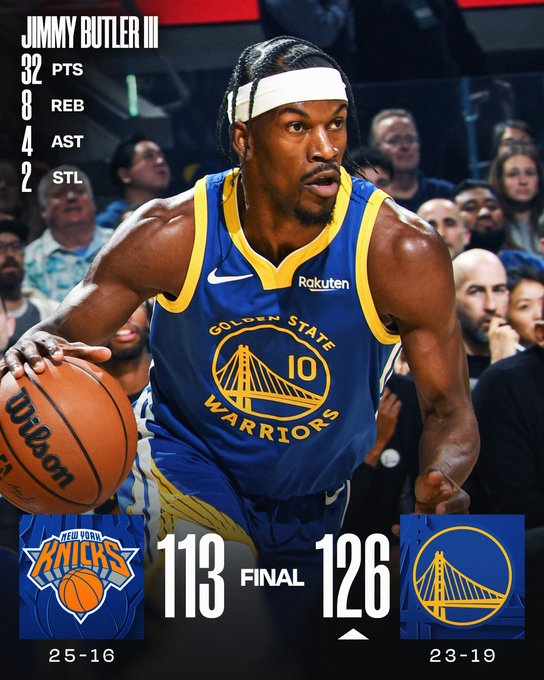 Golden State mostró poder ofensivo con tres jugadores superando los 20 puntos: Jimmy Butler (32), Stephen Curry (27 y 7 asistencias) y Moses Moody (21 con 7 triples). Los Warriors controlaron el cierre ante unos Knicks sin Jalen Brunson, que tuvieron a Deuce McBride y OG Anunoby con 25 cada uno. Karl-Anthony Towns aportó 17 puntos y 20 rebotes, pero no alcanzó.
