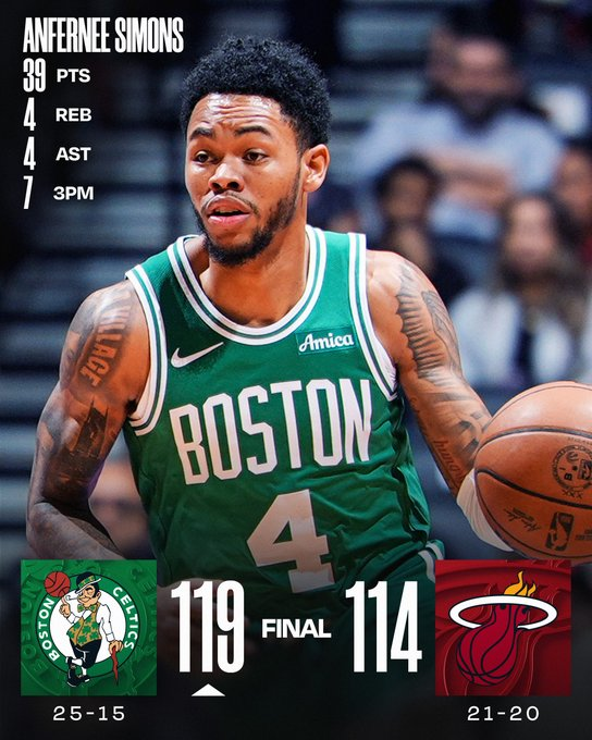 Boston protagonizó una remontada impactante tras estar 19 puntos abajo y definió el juego con un parcial de 36-21 en el último cuarto. Anfernee Simons fue determinante con 39 puntos desde el banco, 18 en el cierre, acompañado por Jaylen Brown (27) y Sam Hauser (17). Miami fue al frente con Norman Powell (26), Bam Adebayo y Tyler Herro (22 cada uno).