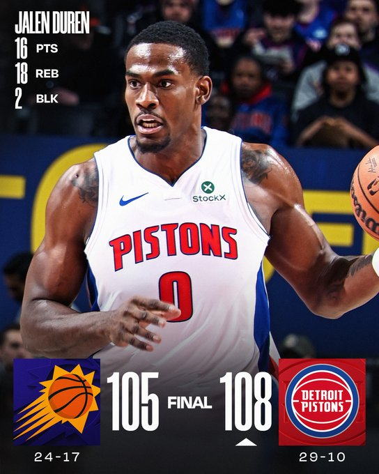 Detroit remontó una desventaja de 16 puntos y sumó su cuarta victoria en cinco juegos con un cierre firme en casa. Duncan Robinson (19 puntos) y Jalen Duren (16 puntos y 18 rebotes) sostuvieron al equipo, que ganó pese a una noche muy errática de Cade Cunningham (10 puntos, 11 asistencias y 13/16 en tiros fallados). Phoenix, sin Devin Booker, tuvo a Grayson Allen como figura con 33 puntos.