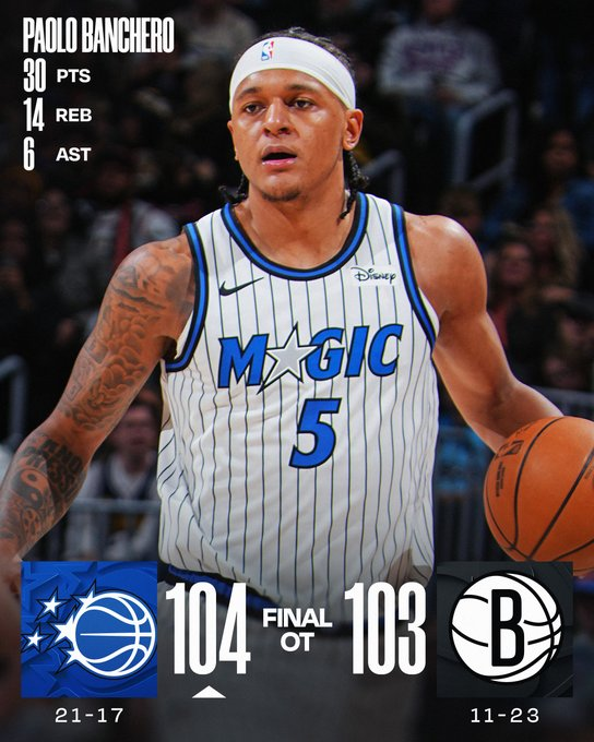 Paolo Banchero fue el héroe al clavar un triple bombeado sobre la bocina del tiempo extra para darle a Orlando su octava victoria consecutiva ante Brooklyn. El alero terminó con 30 puntos, mientras Wendell Carter Jr. aportó 20 y el Magic resistió un duelo cerrado. Michael Porter Jr. brilló con 34 puntos para unos Nets que rozaron la sorpresa.