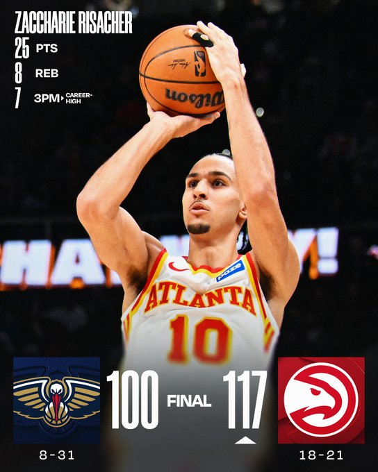 Zaccharie Risacher lideró a Atlanta con 25 puntos en una noche marcada por la noticia del traspaso de Trae Young a Washington en medio del juego. Siete jugadores de los Hawks terminaron en doble dígito y el equipo cortó una racha negativa. En los Pelicans, Zion Williamson reaccionó tras un primer cuarto en cero y cerró con 22 puntos, 8 rebotes y 6 asistencias.