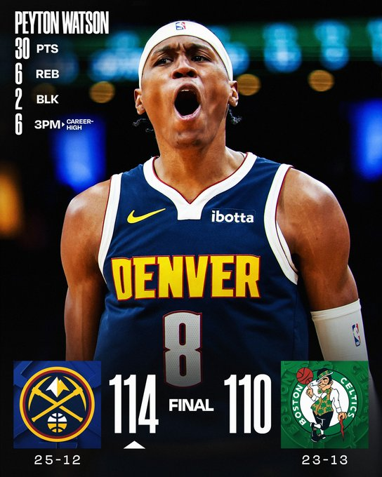 Sin Jokic ni Tatum, Jamal Murray asumió el mando con 22 puntos y 17 asistencias y Peyton Watson explotó con 30 para Denver, que cerró el juego con una racha 14-0 en el último cuarto. Jaylen Brown respondió con 33 puntos para Boston y Neemias Queta capturó 20 rebotes, récord personal. El triunfo cortó la racha de cinco victorias consecutivas de los Celtics.