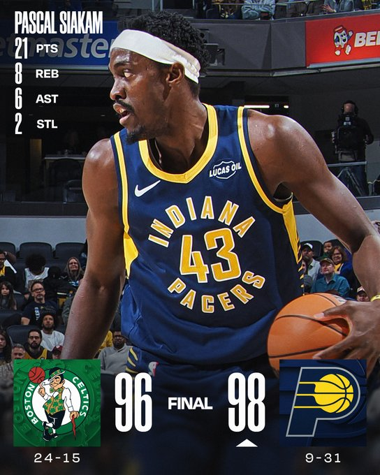 Indiana consiguió su primera racha de tres triunfos en la temporada con una victoria ajustada ante Boston. Pascal Siakam fue decisivo con 21 puntos, 8 rebotes y 6 asistencias, coronando la noche con un lanzamiento ganador a 6 segundos del final. Jay Huff sumó 20 puntos con cuatro triples, mientras que los Celtics sintieron la ausencia de Jaylen Brown. Payton Pritchard lideró a Boston con 23 tantos y 8 asistencias.