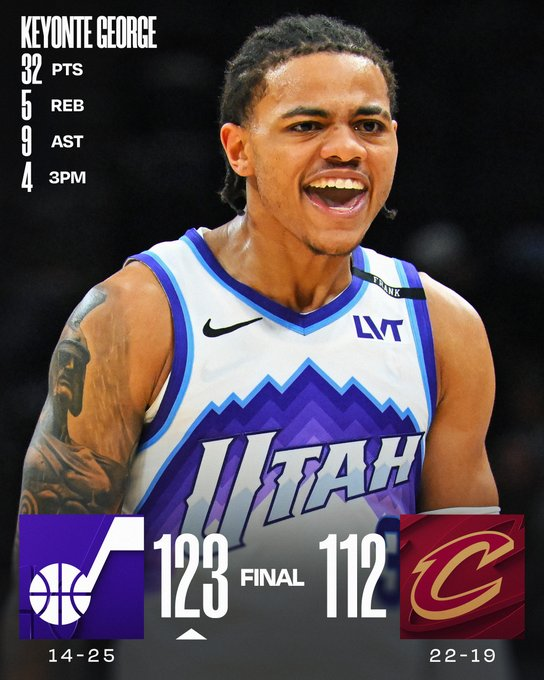 Utah se recompuso del golpe histórico sufrido ante Charlotte y abrió su gira con una victoria de carácter en Cleveland. Keyonte George fue la gran figura con 32 puntos y 9 asistencias. Lauri Markkanen aportó 28 puntos y 12 rebotes, mientras que Jusuf Nurkic regresó con un doble-doble de 11 y 17.