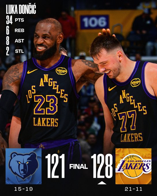 Los Lakers se quedaron con el triunfo gracias a 34 puntos de Luka Doncic y 31 de LeBron James, determinantes en el último cuarto. Memphis, pese a varias ausencias, compitió con 25 de Jaren Jackson Jr. y 20 de Kentavious Caldwell-Pope, pero no pudo sostenerlo en el cierre.