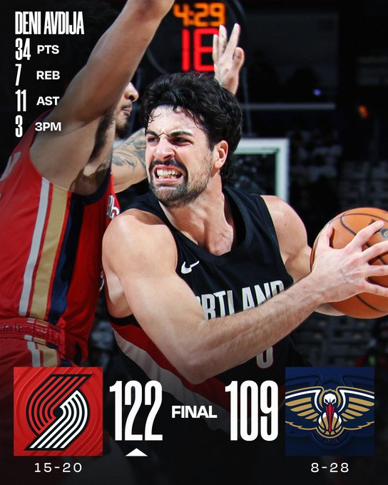 Portland se impuso con enorme noche de Deni Avdija, autor de 34 puntos y 11 asistencias. Shaedon Sharpe sumó 23 y Donovan Clingan dominó en los tableros. Zion Williamson hizo 35, pero los Pelicans, llenos de bajas, extendieron su mala racha.