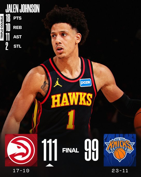 Atlanta venció en el Madison con triple-doble de Jalen Johnson (18-11-10) y 23 puntos de Nickeil Alexander-Walker. Tomó el control desde el primer cuarto y frenó la ofensiva neoyorquina. Jalen Brunson anotó 24 y OG Anunoby firmó 19 con 10 rebotes para los Knicks.