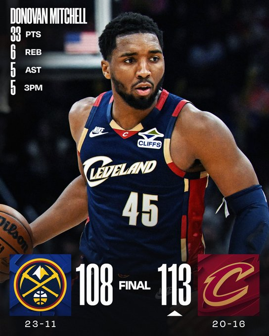 Cleveland derrotó a un diezmado Denver con 33 puntos de Donovan Mitchell y 18 más 8 asistencias de Darius Garland. Los Nuggets, sin Jokic, desperdiciaron su ventaja final pese a los 34 puntos de Jamal Murray. Los Cavs dominaron el rebote 55-32 y cerraron mejor.