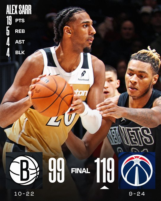 Washington consiguió su cuarto triunfo en cinco juegos gracias a 20 puntos de Justin Champagnie y 19 de Alex Sarr. Dominaron el rebote 51-33 y limitaron a Brooklyn a solo seis triples. Los Nets, que tuvieron a cuatro jugadores con 14 puntos, perdieron su tercer partido consecutivo.
