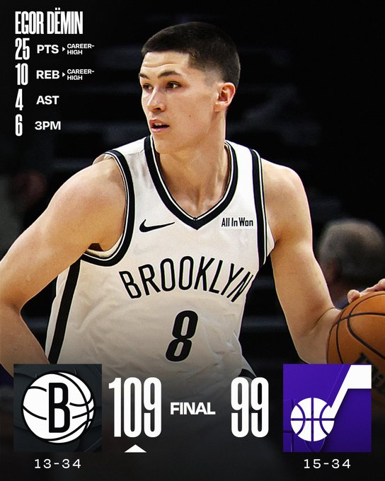 Egor Demin estableció un récord para un rookie de la NBA al anotar un triple en su 34º partido consecutivo y terminó con 25 puntos y 10 rebotes para ayudar a los Brooklyn Nets a romper una racha de siete derrotas consecutivas con una victoria por 109-99 sobre los Utah Jazz el viernes por la noche. Demin, quien encestó 6 de 12 triples, estableció la marca en la primera canasta para Brooklyn. Cam Thomas añadió 21 puntos para los Nets, Day’ron Sharpe tuvo 16 puntos y nueve rebotes, y Danny Wolf añadió 14 puntos.