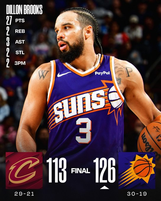 Dillon Brooks siguió prendido fuego tras los 40 puntos a Detroit del jueves y le metió 27 a Cleveland para el triunfo de los Suns 126-113, completando un gran back to back de los de Arizona. Los Suns sumaron su tercera victoria en fila sin su máxima figura, Devin Booker.