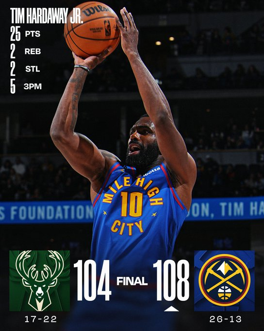 A pesar del enorme partido de Giannis Antetokounmpo, Milwaukee cayó 108-104 ante Denver. El griego se despachó con 31 puntos, 11 asistencias y 8 rebotes, pero ni así le alcanzó a los Bucks. Tim Hardaway Jr, desde el banco, fue el goleador de los Nuggets con 25 tantos. Tim Hardaway Jr. anotó 25 puntos, Aaron Gordon sumó 23 y los Denver Nuggets, diezmados por las lesiones, vencieron. Peyton Watson consiguió 19 unidades, ocho rebotes y seis asistencias para los Nuggets. En los últimos siete partidos de su equipo, el escolta de cuarto año ha estado promediando 23,7 tantos y 6,9 rebotes por juego. Zeke Nnaji añadió 14 puntos y 11 rebotes para su primer doble-doble de la temporada.