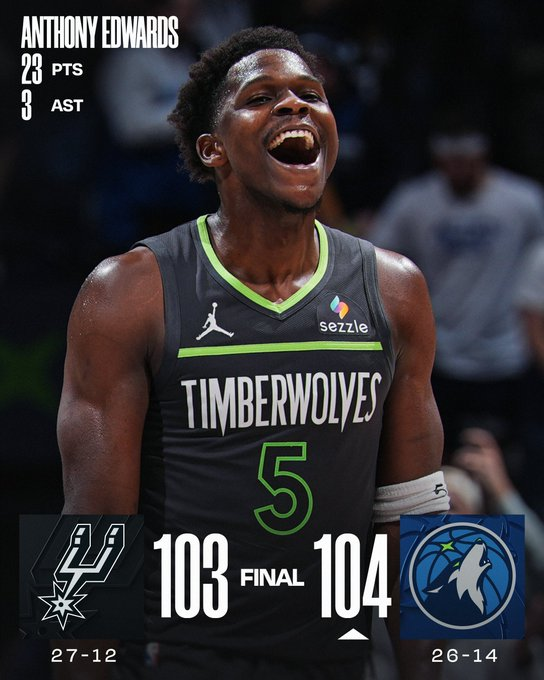 Anthony Edwards firmó este domingo la canasta decisiva para tumbar a los San Antonio Spur y tomó la última palabra en el thriller de Minneapolis, al conectar la canasta decisiva a 17 segundos del final para frenar a los San Antonio Spurs, segundos en el Oeste. ‘Ant’ selló 23 puntos y Donte DiVincenzo se salió con 19 puntos, nueve rebotes, siete asistencias y tres robos para los Wolves, que sobrevivieron al potente regreso del francés Victor Wembanyama al quinteto titular de los Spurs. Wemby anotó 29 puntos y capturó seis rebotes en 26 minutos en pista, pero su equipo terminó pagando su modesto 38 % de acierto en tiros de campo a nivel grupal.