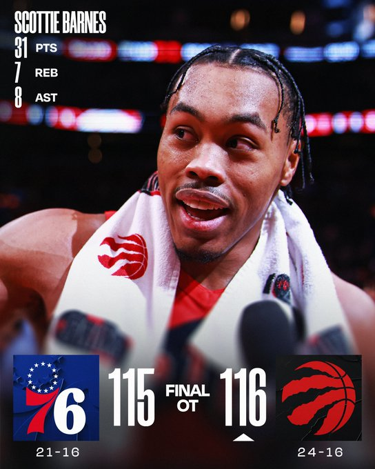 Seguimos con el que fue el gran juego de la jornada: Toronto le ganó a los Sixers en Canadá por 116 a 115, en tiempo suplementario. Los Raptors tuvieron a Scottie Barnes como su mejor jugador, con 31 tantos y 7 asistencias. En Philadelphia brilló Maxey, que clavó 38 unidades.