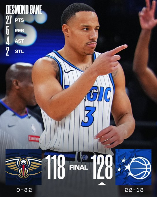 Cerramos con la victoria de Orlando Magic en Florida por 128 a 118 ante los Pelicans. El conjunto ganador tuvo a un destacado Paolo Banchero, que estuvo cerca del triple-doble y sumó 23 puntos, 8 rebotes y 8 asistencias.