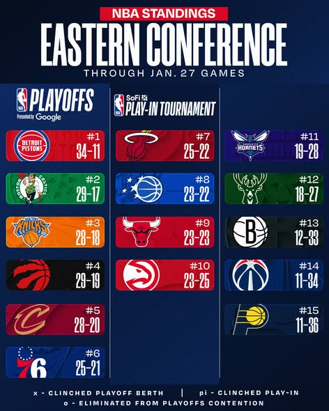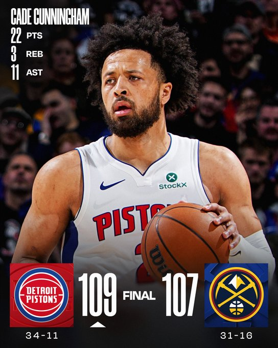 La Conferencia Este está liderada por los Detroit Pistons (34-11), que doblegaron 109-107 a los Nuggets en Denver con 22 puntos y once asistencias de Cade Cunningham y 22 puntos de Tobias Harris. Los Nuggets son terceros en el Oeste (31-16), pese a seguir sin poder contar con el serbio Nikola Jokic por un problema de rodilla. Jamal Murray fue el máximo anotador de los campeones NBA de 2023 con 24 puntos.