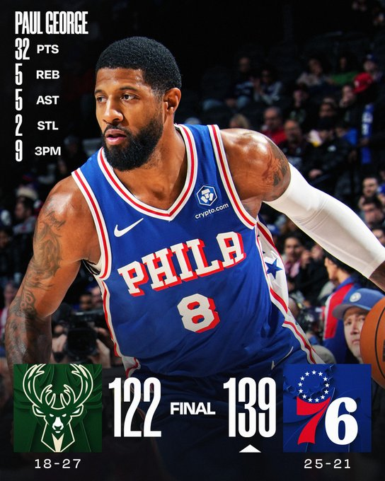 En Philadelphia, Paul George firmó la mejor actuación de su temporada, con once de 21 en tiros de campo y nueve de quince desde el arco para 32 puntos. Joel Embiid contribuyó en la victoria con 29 puntos, nueve rebotes y cinco asistencias y Tyrese Maxey aportó 22 puntos y nueve asistencias para los Sixers, que dejaron atrás el humillante 130-93 sufrido el lunes en Charlotte.