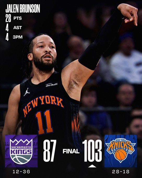 Los Knicks sellaron su tercera victoria consecutiva, con un 103-87 en el Madison Square Garden contra los Sacramento Kings liderado por 28 puntos de Jalen Brunson. Los Knicks estaban empatados a 72 entrando en el cuarto período, pero consiguieron un 31-15 que les entregó un valioso triunfo para seguir presionando a los Boston Celtics por la segunda plaza del Este.