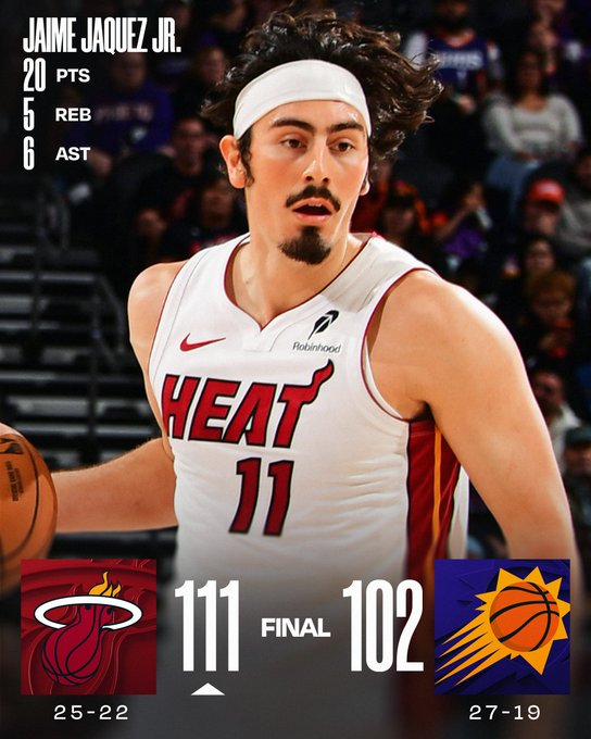 Con 20 puntos de Jaime Jaquez desde la banca, una producción completa de Bam Adebayo (22 puntos y 7 rebotes), y otra de Normal Powell (16+10), el Heat se llevó un gran triunfo de Arizona ante Phoenix, que no tuvo a su estrella, Devin Booker.