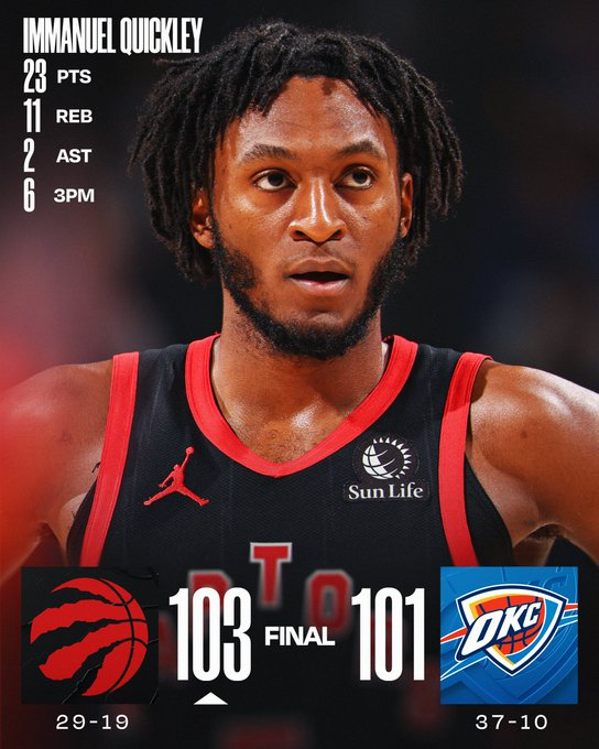 Otra derrota de local para el antes invencible OKC, que se convirtió de repente en un equipo terrenal que puede perder contra cualquiera. Si bien los Raptors son uno de los mejores equipos del Este, no era un resultado esperado. El partido fue parejo en todo su desarrollo y OKC ganaba por 2 a 2 minutos del final cuando Immanuel Quickley otra vez se convirtió en héroe, con un doble, un triple y dos libres para sentenciar el juego. Fue a figura con 23 puntos y 11 rebotes.