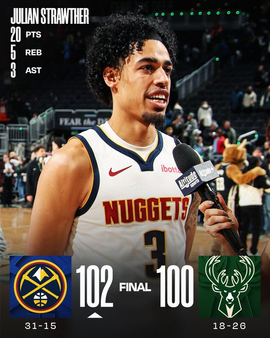 En un partido repleto de ausencias (Jokic, Murray antes y Gordon durante el juego por Denver, Giannis por Milwaukee), los Nuggets encontraron la llave en Julian Strawthe (20 puntos), para vencer 102-100, en un partido que dominó cómodo hasta el último cuarto y se le terminó complicando.