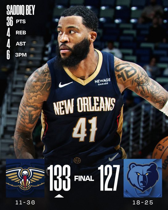 Los Grizzlies no dan pie con bola y anoche cayeron de locales ante el peor equipo del Oeste, New Orleans, 127-133. Saddiq Bay metió 19 de sus 36 puntos (su tope del año) en el último cuarto y liquidó las chances de los de Ja Morant, que no jugó, lo que alimentó los rumores sobre su posible trade.