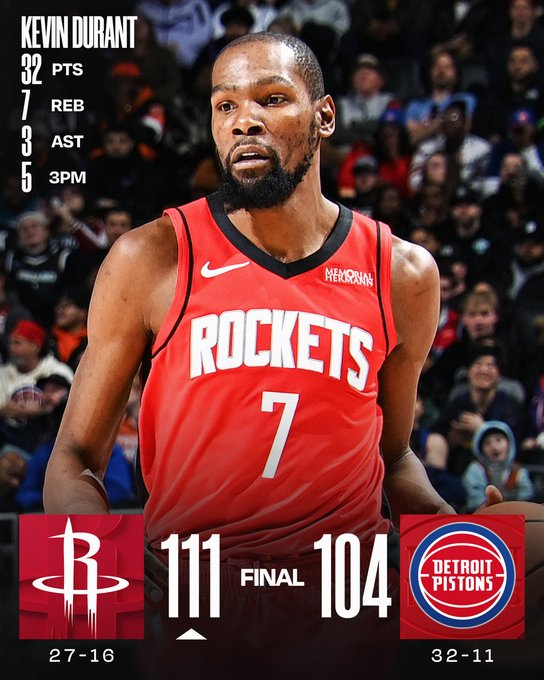 Cuando Detroit se cruza contra los buenos del Oeste, ya no es tan fácil, y Houston le hizo morder el polvo en su propia casa, con Kevin Durant ardiente (32 puntos). KD los tiene de hijos a los Pistons. Promedia 30.6 en su carrera ante ellos, la más alta que ante cualquier otro rival. Houston clavó un 34-20 decisivo en el 3º cuarto y aunque Detroit se puso a 4 en el último, se quedó corto.