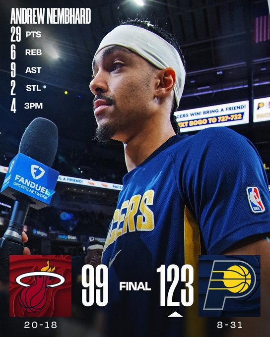 Andrew Nembhard fue la figura con 29 puntos y 9 asistencias, guiando a Indiana a una victoria sin sobresaltos en la que nunca estuvo en desventaja. Los Pacers clavaron 17 triples, con Micah Potter sumando 14 puntos desde el banco. Miami, limitado, tuvo 21 puntos de Tyler Herro, 16 de Jaime Jaquez Jr. y 13 más 9rebotes de Bam Adebayo en una noche cuesta arriba desde el arranque.