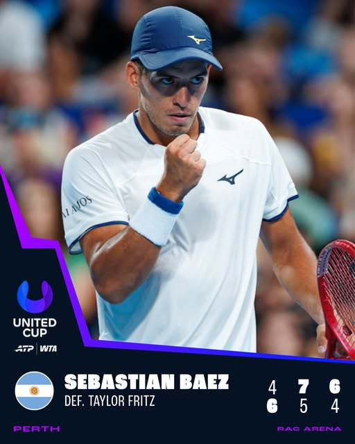 Antes, Báez sorprendió a la número 6 del mundo, Fritz, por 4-6, 7-5, 6-4. El jugador de 25 años derrotó al español Jaume Munar en su primer partido en el torneo de equipos mixtos el viernes y lo revalidó con una de las mejores actuaciones de su carrera contra Fritz, quien mostró signos de desgaste durante las dos horas y 35 minutos del choque.