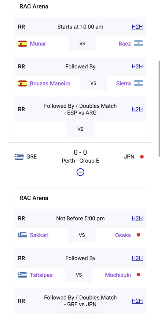 Para la sesión vespertina, Grecia jugará ante Japón, con Naomi Osaka y Maria Sakkari abriendo una eliminatoria en la que Stefanos Tsitsipas se medirá a Shintaro Mochizuki, previo al duelo de dobles mixto, todo a partir de las 17 ern Australia, las 6 de la madrugada en nuestro país. .