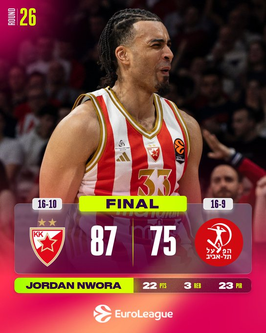 La Estrella Roja continuó su ascenso en la clasificación al derrotar al Hapoel por 87-75 en casa, logrando su quinta victoria consecutiva. El Estrella Roja tomó el control del partido con un inicio de 14-0 en el último cuarto para mejorar su marca a 16-10, permitiendo solo 6 puntos en el último cuarto.