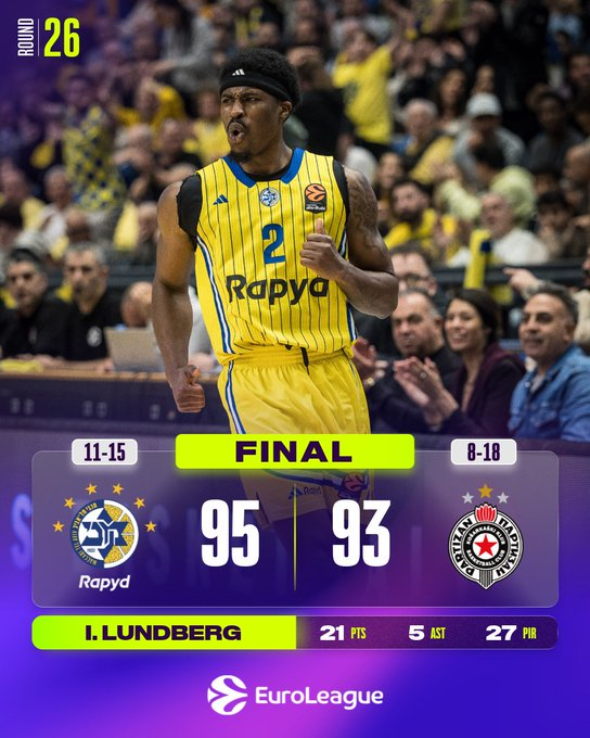Iffe Lundberg y Clark lideraron al Maccabi con 21 puntos cada uno. El primero sumó 5 asistencias y 4 rebotes, mientras que el segundo repartió 4 asistencias. Ambos jugadores ofrecieron excelentes actuaciones individuales. Marcio Santos aportó 17 puntos y Roman Sorkin 10. En el otro extremo del campo, Sterling Brown anotó 19 puntos para el Partizan, mientras que Dylan Osetkowski y Bruno Fernando anotaron 17 cada uno.