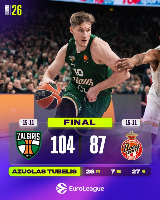 El Zalgiris lideró de principio a fin su camino a la goleada al Mónaco por 104-87. Con la victoria, el Zalgiris arrasó en la serie de la temporada regular contra el Mónaco y ambos equipos están empatados con un récord de 15-11.