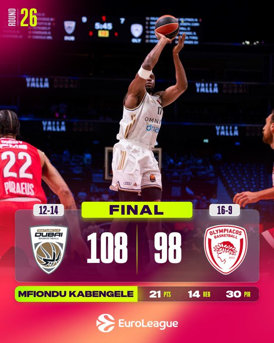 Tras su novena victoria en casa, Dubái mejoró su récord a 12-14. Mientras tanto, la racha de cinco victorias consecutivas del Olympiacos llegó a su fin, con el equipo griego cayendo a 16-9. Dwayne Bacon y Mfiondu Kabengele anotaron 21 puntos cada uno, y este último también capturó 14 rebotes. McKinley Wright anotó 18 puntos y Aleksa Avramovic 17, 15 de ellos en la primera mitad. Tyler Dorsey anotó 18 puntos y Evan Fournier añadió 16 en un partido que terminó en derrota.