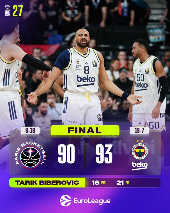 Biberovic lideró al Fenerbahçe con 19 puntos, mientras que Talen Horton-Tucker y Wade Baldwin siguieron impulsando la ofensiva con 15 y 14 puntos respectivamente, y Brandon Boston añadió 11. Nadir Hifi lideró al Paris con 23 puntos, con 6 de 16 en tiros de campo, Jared Rhoden añadió 16 puntos y Justin Robinson anotó 14 en una derrota. El Fenerbahçe remonta a 19-7 y mantiene el primer puesto, mientras que el París cae a 8-18.